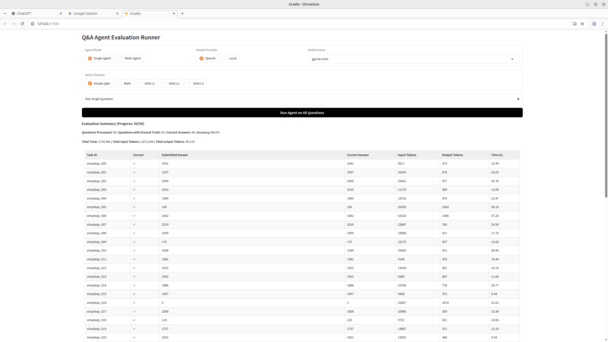 A benchmarking pipeline to evaluate my agent across multiple question–answer datasets, with granular control over models, prompts, tools and memory as well as traces and metrics capturing using smolagents.